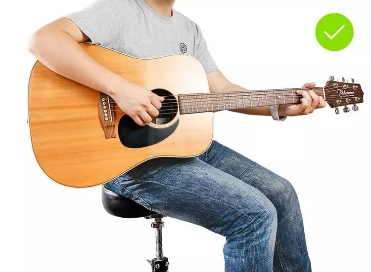 首先,你应该要用自己最舒服的姿势坐下来啦!如果你是右手弹奏,则左手要轻松的能够够到吉他琴颈的任何部位。背部挺直而放松,另外手腕放轻松而不要弯曲太厉害。 将木吉他的凹陷处放在与拨弦的手同侧的腿上。总之,这一定会要是你最舒服的姿势。