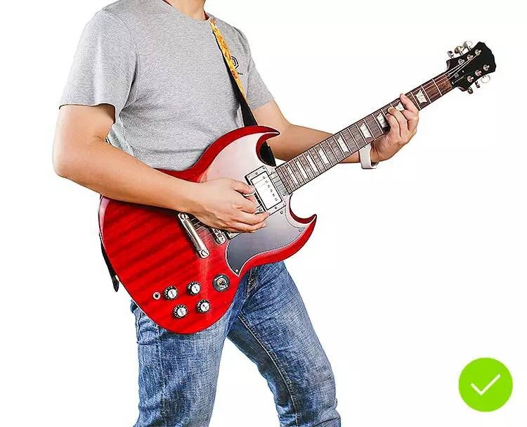 当然,坐姿的原则同样适用于站姿。不过,为了能够站起来演奏吉他,你就需要一根背带了!背带的一端系在旋钮旁边的琴颈上,或在琴颈和琴体的连接处;另一端系在吉他底部的背带钉上。站姿也需要保证两只手都可以在吉他上自如的移动。根据手的长度,可以稍微调整吉他的角度,以便能轻松的按到指板的任何位置。