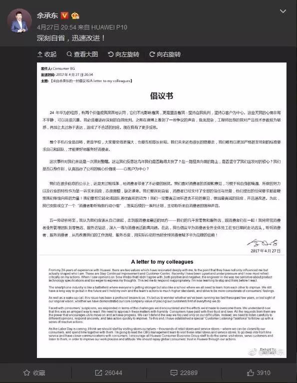 余承东微博之前发给同事的倡议书