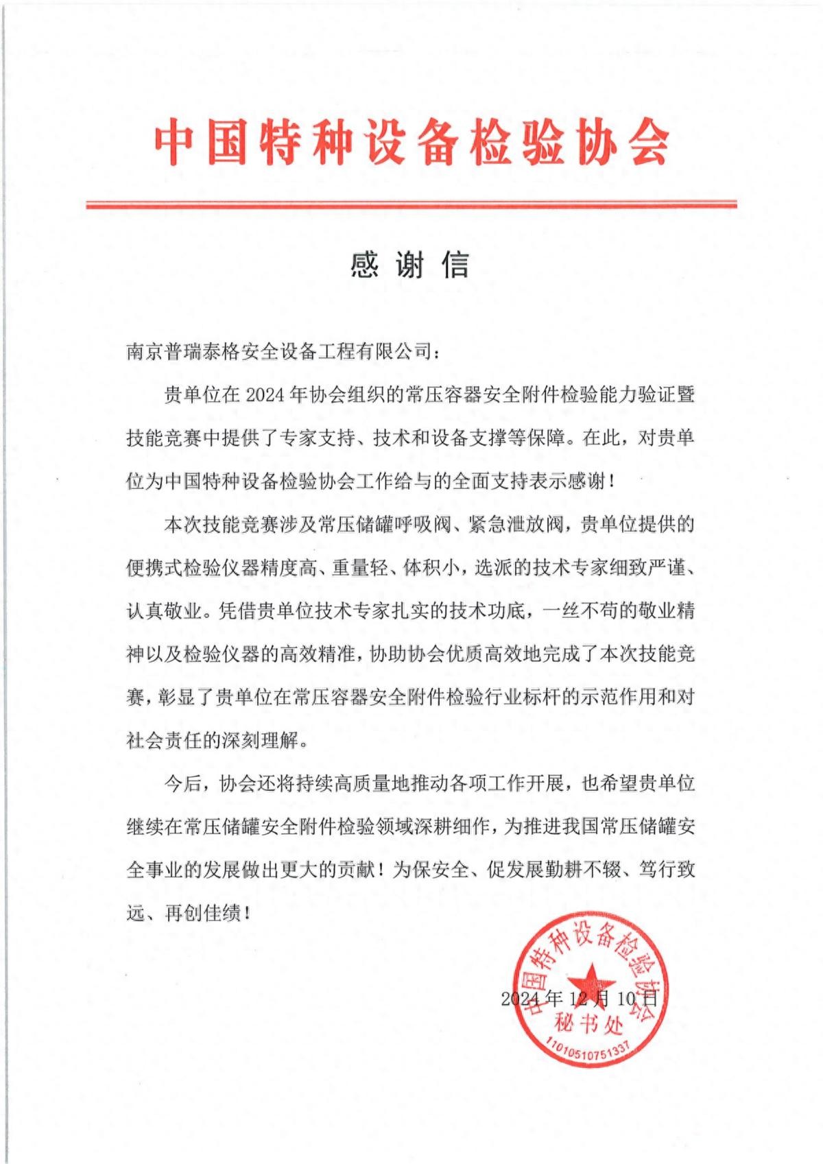 11月29日,由中国特种设备检验协会主办的“2024年度常压容器安全附件检验能力验证活动暨技能竞赛”在江苏泰州举行。南京普瑞泰格安全设备工程有限公司(以下简称“普瑞泰格”)为此次技能竞赛活动提供了专家支持、技术和设备支撑等保障,也因此收到了来自中国特种设备检验协会的感谢信,获得了协会的认可与赞誉。