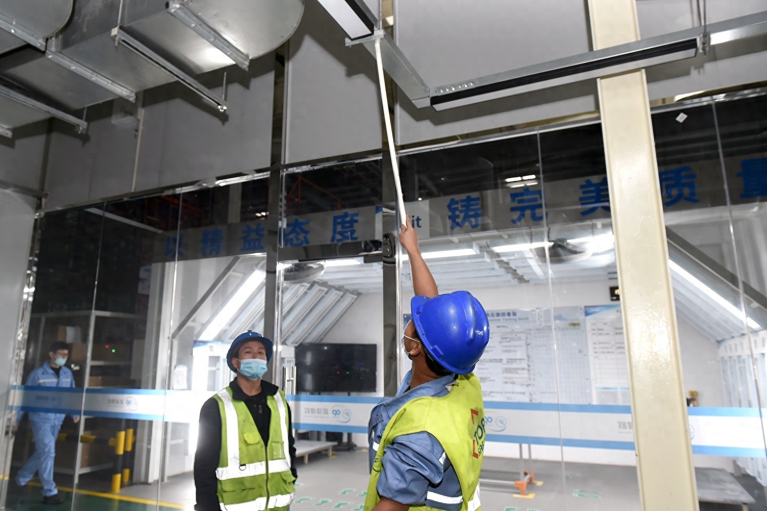 在赛科利公司18000多平米的厂房内,一处被透明玻璃围住的宽阔屋子正在施工,就修建在人员较为集中的质检车间旁。走进屋内,关上房门,记者明显感觉到厂房运作机器的声音小了不少,赛科利公司工会负责人慕超介绍,这是新建的职工休息室。6天前,这里还是一片空地,为抓紧投入使用,三位师傅正紧张施工。