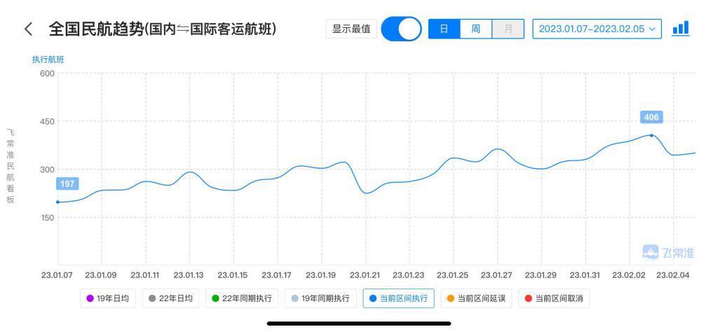 记者从飞常准 App 了解到,根据民航看板数据显示,2025 年春运前 30 天(1 月 7 日 -2 月 5 日)国内航线日均执行客运航班量 1.14 万班次,实际执行国内客运航班量 34.25 万班次,相比 2025 年春运同期增长 17%;已恢复 2025 年春运同期九成以上水平。国际及地区航线日均执行客运航班量 294 班次,实际执行国际及地区客运航班量 8807 班次,相比 2025 年春运同期增长 130%;较 2025 年疫情前春运同期恢复了 10% 左右。值得注意的是,时隔近 3 年时间,2 月 3 日国际及及地区单日客运航班量首次恢复至 400 班次以上。