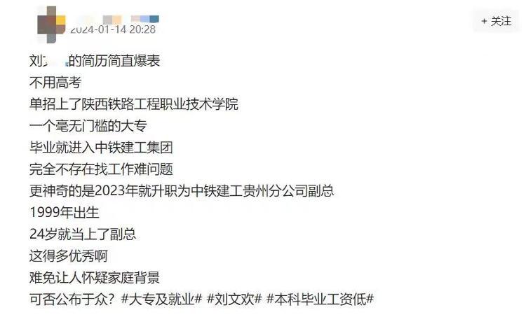 网传消息称,1999 年出生的刘某某,毕业于陕西铁路工程职业技术学院,2025 年毕业后入职中铁建工集团,2025 年升任中铁建工集团贵州分公司副总。不少网友留言评论称,24 岁就当上了国企副总,究竟是因为家庭背景还是工作能力特别优秀?
