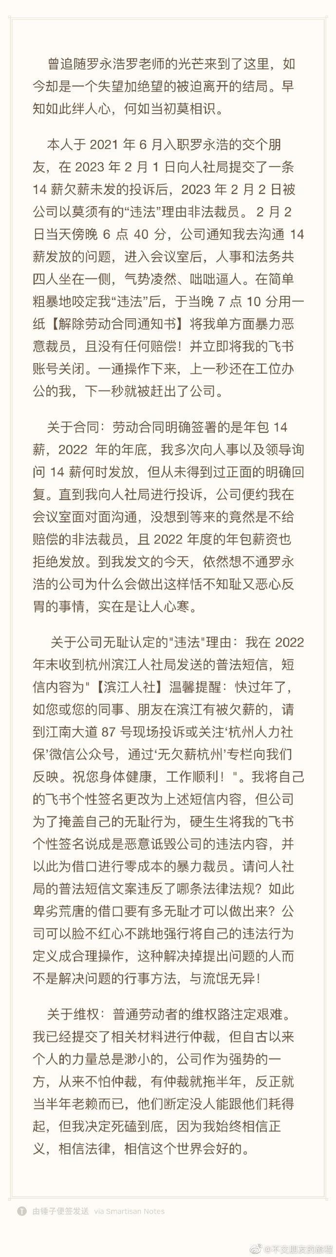 据该员工介绍,他本人于 2025 年 6 月入职罗永浩的交个朋友,在 2025 年 2 月 1 日向人社局提交了一条 14 薪欠薪未发的投诉后,2025 年 2 月 2 日被公司以莫须有的 " 违法 " 理由非法裁员。