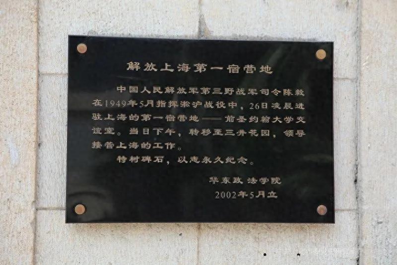 66. 解放上海第一宿营地旧址。解放上海第一宿营地旧址位于上海市万航渡路1575号华东政法大学内(原极司非尔路圣约翰大学交谊楼)。圣约翰大学是美国基督教圣公会在上海创办的一所教会大学。学校主要原建筑有怀施堂(韬奋楼)、六三楼、交谊楼等,多为中西合璧式建筑。交谊楼建于1929年。1949年5月26日,中国人民解放军第三野战军进驻上海,曾把交谊楼作为宿营地之一。三野司令员陈毅、政委饶漱石和上海局书记刘晓在此会见上海局副书记刘长胜及中共上海市委部分负责同志,研究部署上海解放后的接管工作。