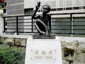 78. “小萝卜头”宋振中烈士塑像。“小萝卜头”宋振中烈士塑像位于上海市虹口区欧阳路67号。1989年6月“小萝卜头”宋振中烈士塑像落成于虹口区昆山花园内,1998年迁入这里的虹口区青少年活动中心。宋振中的父母都是共产党员,父亲宋绮云是杨虎城将军的秘书。1941年9月,宋振中的父母被国民党反动派秘密逮捕,他也被带进了监狱,曾被关押在重庆歌乐山下的白宫馆和贵州息烽集中营。入狱时年仅8个月的宋振中跟着母亲徐林侠在女牢中长大,由于终年住在阴暗、潮湿的牢房里,吃的是发霉发臭的米饭,营养严重不良,大头细身子,面黄肌瘦,难友们都疼爱地叫他“小萝卜头”。宋振中六岁的时候,他的父亲提出让他出去上学,特务们怕暴露他们的罪行,硬是不让,经过多次斗争,才同意由同监狱的政治犯教他念书。宋振中学习刻苦,记忆力很强,非常尊敬老师。监狱生活使他懂得了许多道理,国民党特务对共产党人的非人虐待、折磨,共产党员坚贞不屈、英勇斗争的精神都留给他深刻的印象。由于他年龄小,特务们对他的看管不是很严,他就经常在牢房之间传递信息。每当大人商量事情,他总是坐在门口放哨。1949年9月6日,宋振中和他的父母惨遭杀害。解放后,人民政府追认宋振中和他的父母为革命烈士。