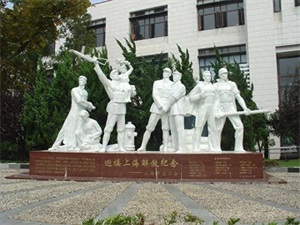 21. 迎接上海解放纪念群雕。“迎接上海解放”纪念群雕位于平凉路1500号,是为纪念“五卅”运动60周年和上海市总工会成立60周年而建造的,于1985年5月7日上海解放纪念日正式落成。整座雕塑用玻璃钢精心制作,通体白色,高5米,长8米,宽2米,雕塑由8个不同形象的人物组成,生动再现了地下斗争、上海解放、解放军和工人纠察队会师以及护厂斗争4个场景。