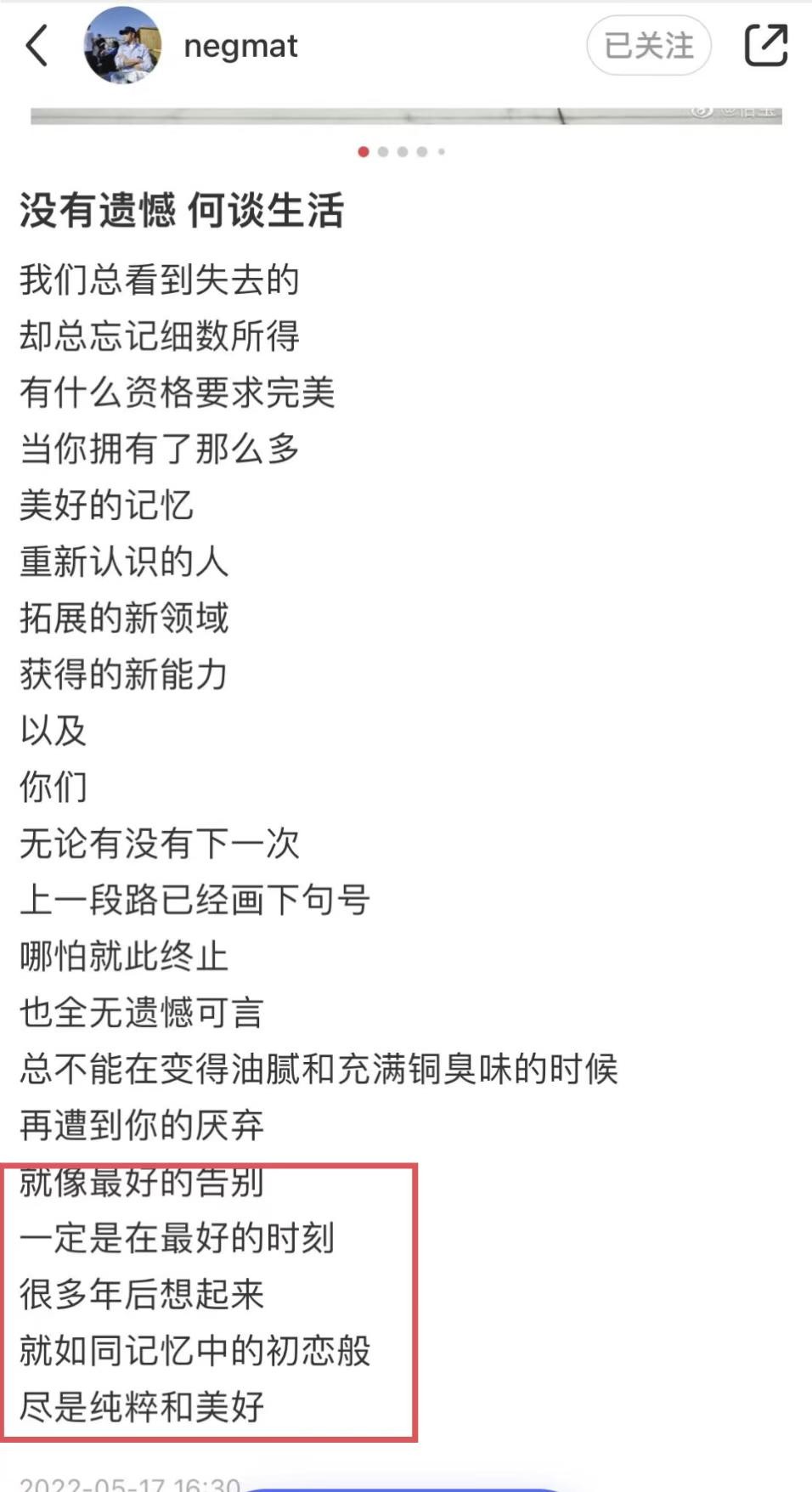 尼格买提也曾经在微博上发表过一段文字,他表示最好的告别,是在最好的时刻。即使是多年后回想起来,也会如同记忆中那般初恋似的美好和纯粹。