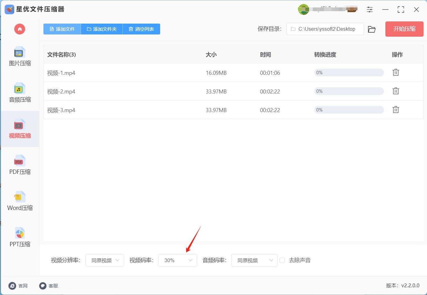 步骤3:在软件界面底部找到压缩设置选项,重点调整 “视频码率”,一般设置为 30% 左右即可,码率越低,视频压缩后的文件越小,其他参数可根据个人需求使用默认值。