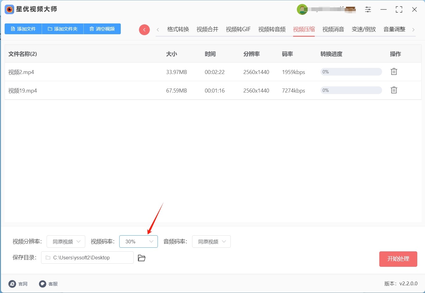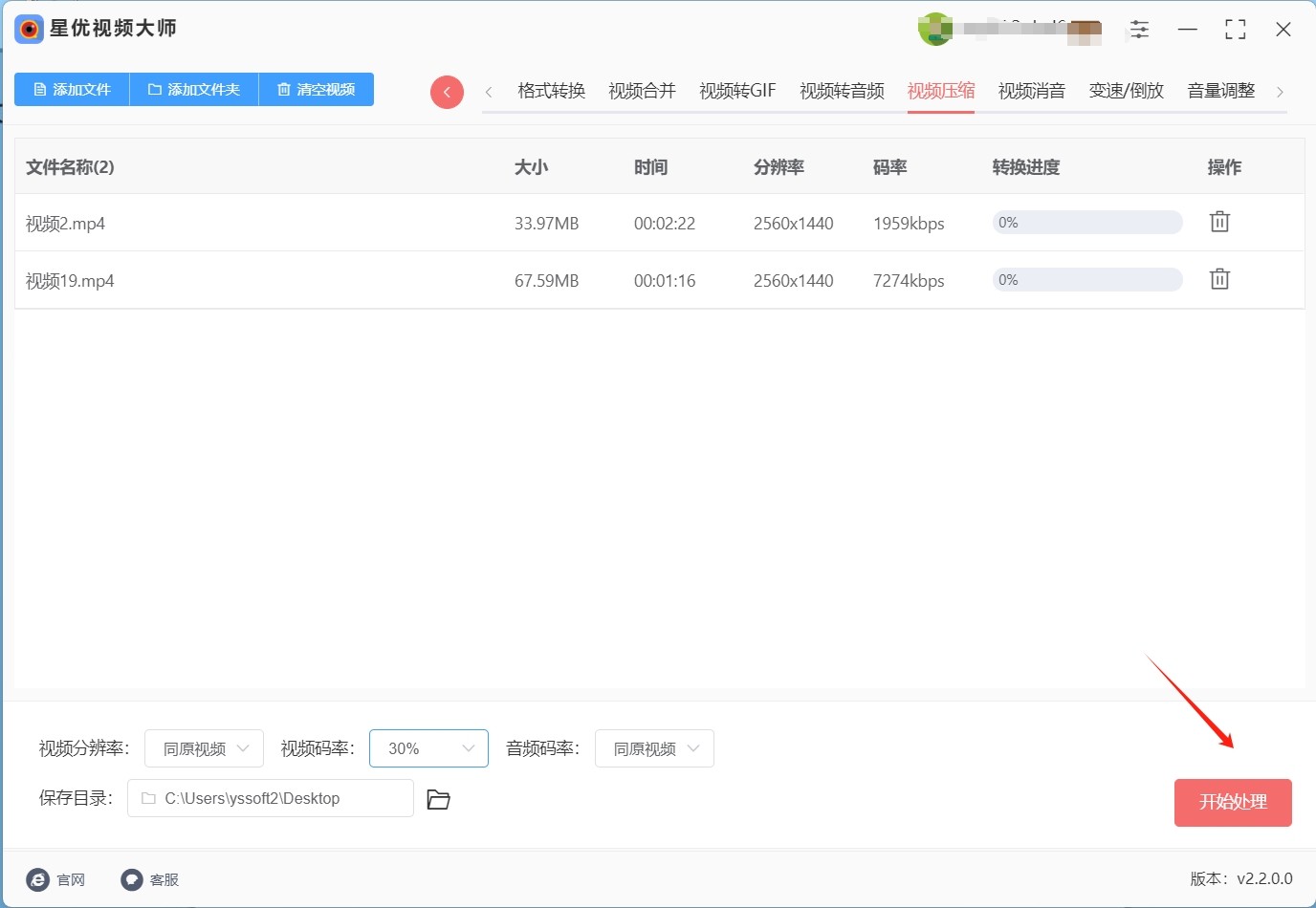 步骤4:设置好所有参数后,点击 “开始处理” 按钮,“星优视频大师” 将开始压缩视频文件,压缩过程中可在软件界面上看到压缩进度。压缩完成后,软件可能会自动打开输出目录,显示压缩后的视频文件,此时可查看文件大小及视频质量,若不满意可重新调整参数再次压缩。