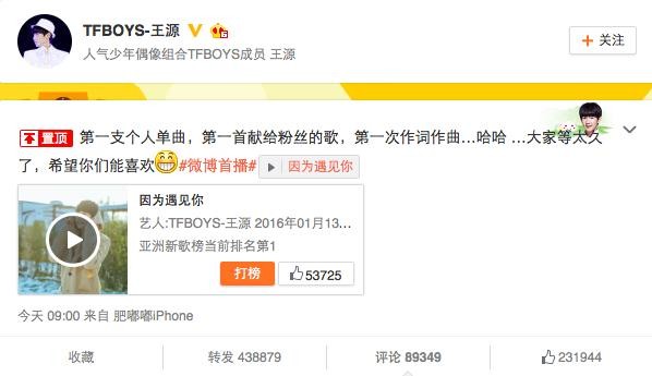 1月13日,TFBOYS主唱王源发布了首支原创单曲《因为遇见你》,这是王源第一次自己作词作曲,并表示是写给粉丝的歌。很快,“王源”、“王源你要来我家看猫吗”成为新浪微博热搜词;微博话题#王源自作曲因为遇见你#和#00后原创歌手王源#等话题也迅速占据了榜单前列,不少网友表示“好听到耳朵怀孕了”,王源小鲜肉又趁机收割一大波亲妈粉。