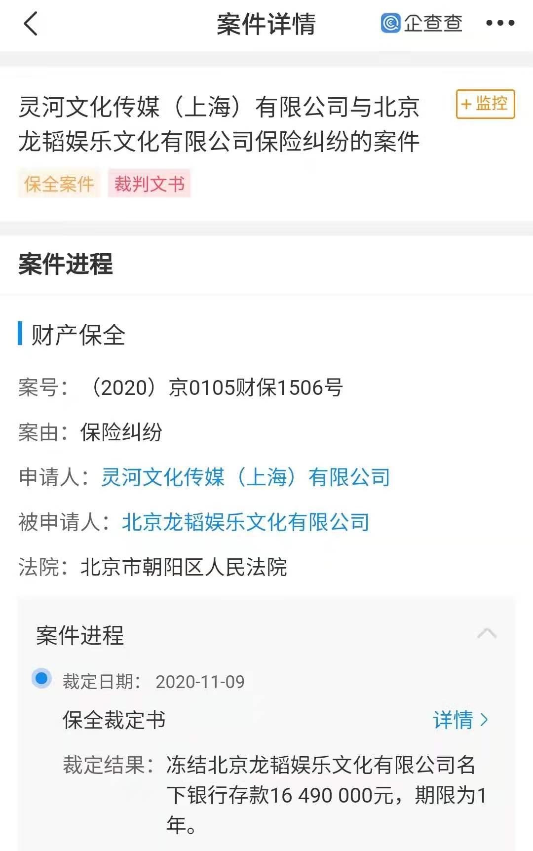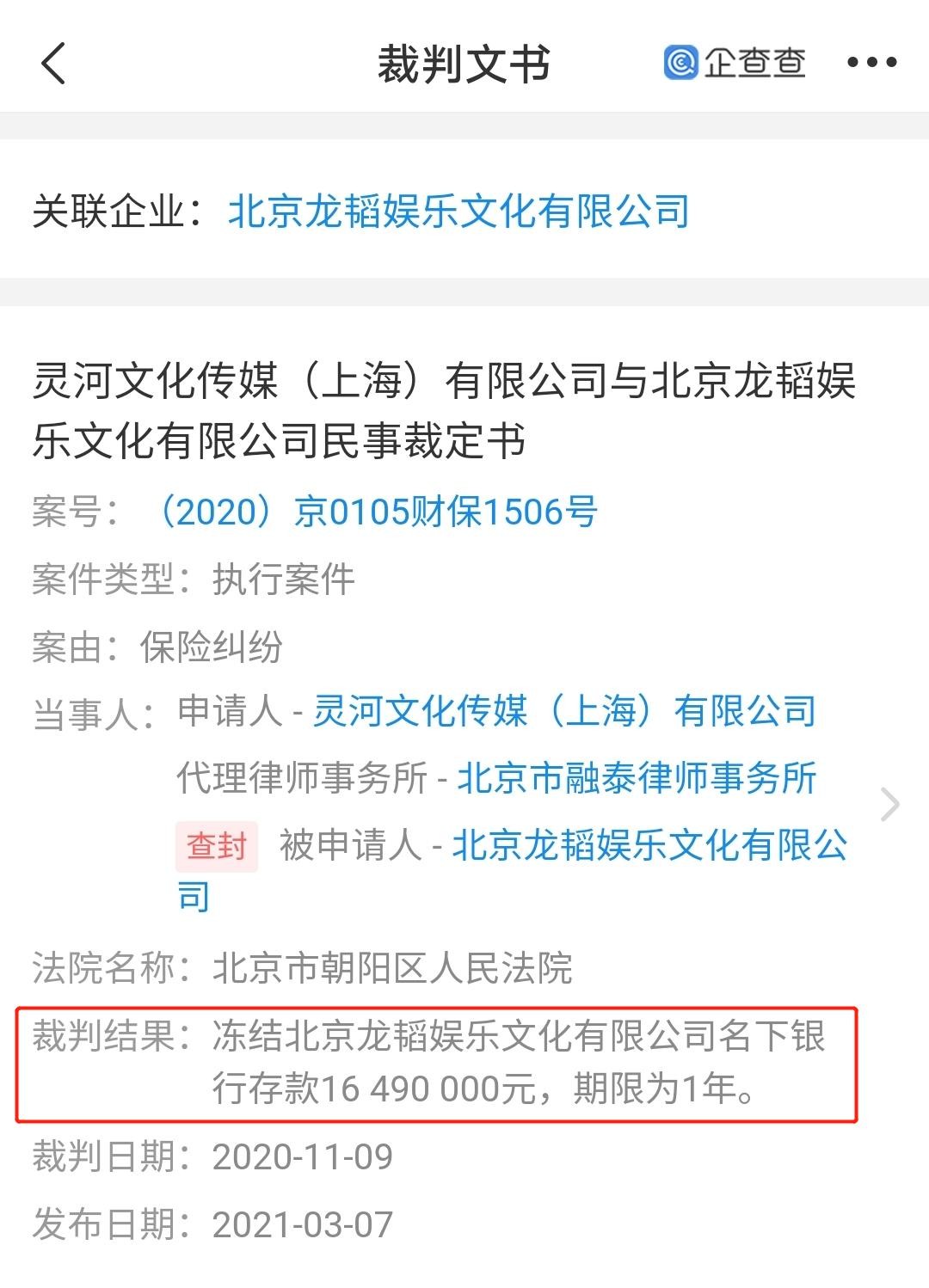 5月11日,山东商报·速豹新闻网(subaoxw.com)记者注意到,北京龙韬娱乐文化有限公司近期因保险纠纷被冻结名下银行存款1649万,申请人为灵河文化传媒(上海)有限公司。企查查信息显示,黄子韬为龙韬娱乐最大股东、实际控制人、最终受益人。