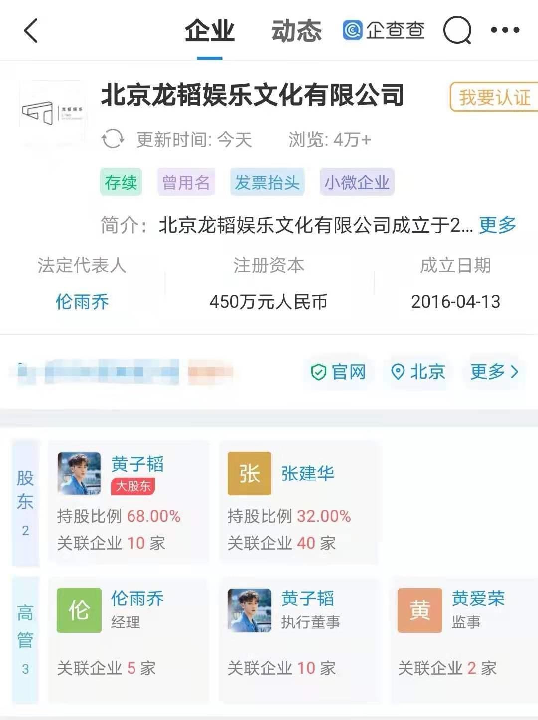 记者注意到,北京龙韬娱乐文化有限公司成立于2016年4月,是一家综合型娱乐文化有限公司,公司前身为北京天浩盛世影业有限公司,2018年7月,正式更名为北京龙韬娱乐文化有限公司。公司以艺人经纪与影视剧制作发行为主要运营业务。黄子韬为龙韬娱乐实际控制人,持有其68%的股份。