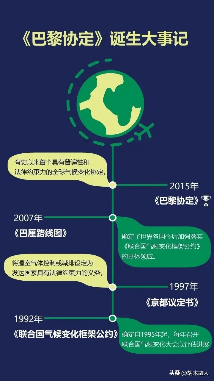 2015年12月12日,178个国家的领导人在法国巴黎签署了一项关于共同应对全球气候变化的协议,这个协议就是著名的《巴黎气候协定》,简称《巴黎协定》,《巴黎协定》于2016年正式生效。
