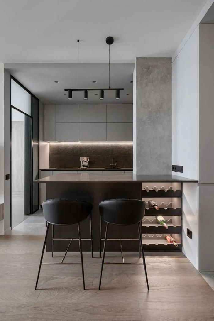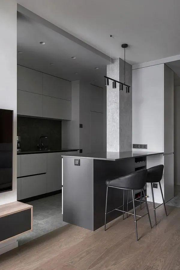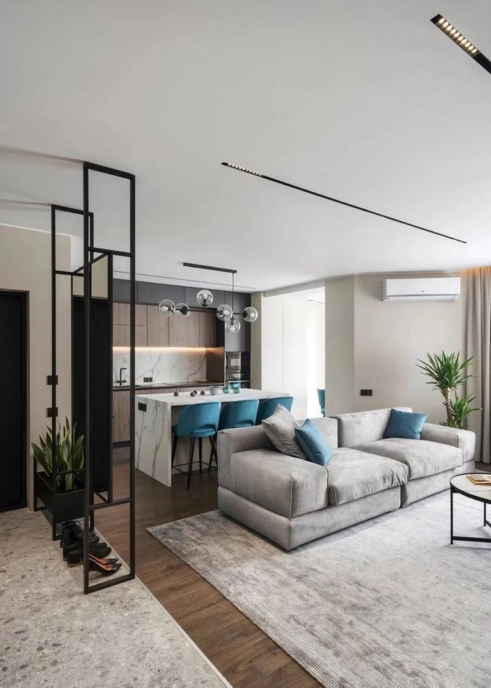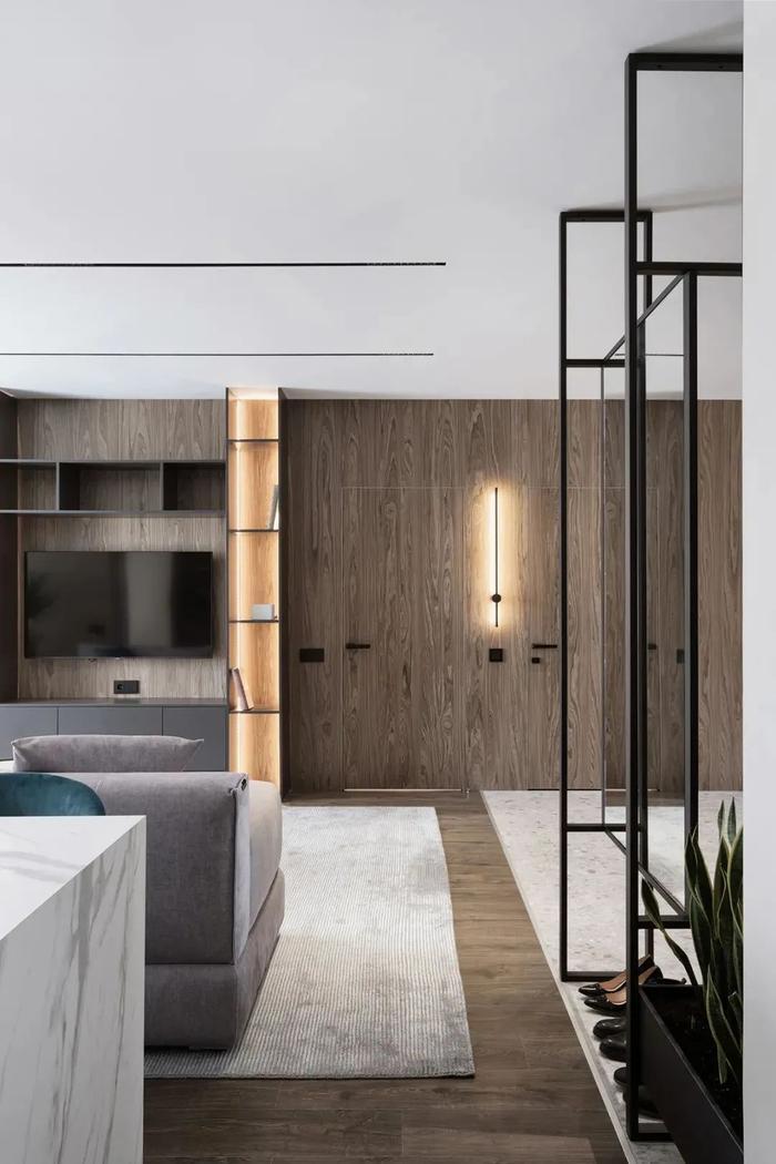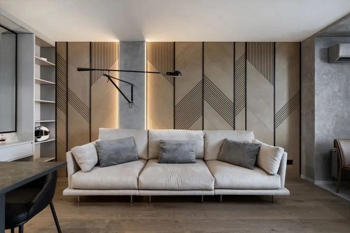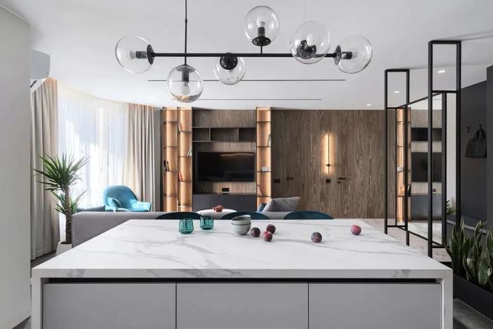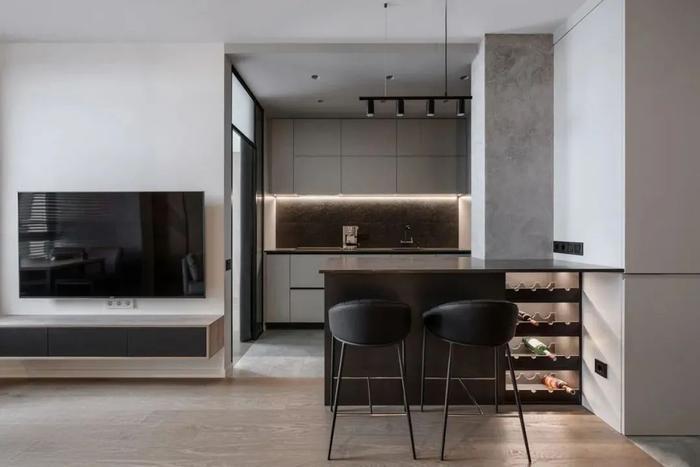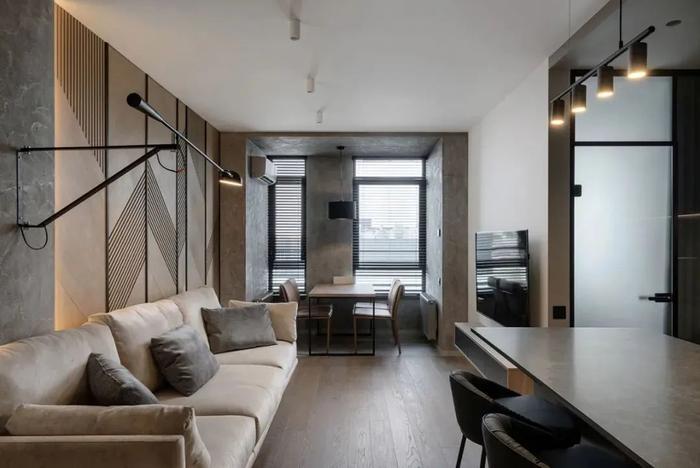 这是一间68㎡的空间,节奏与松弛相得益彰。开放式的空间带来开阔的视野,物件的摆放无形中区分每个区域。颇有设计感的饰面,条形纹理形成严谨随意的构图。餐厅与厨房相结合,让空间更合理的规划。