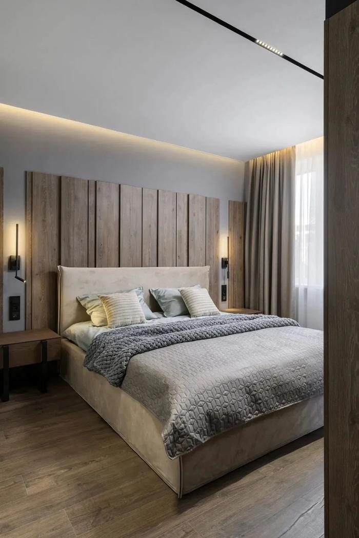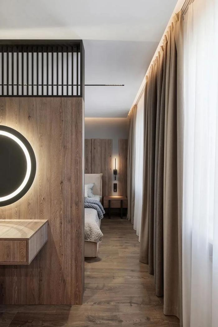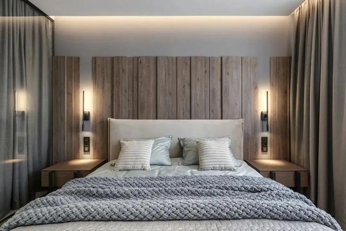 卧室以木材作为主要搭配元素,被温暖的原木包裹着,柔软的床品与柔和的灯光打造温馨的气氛。