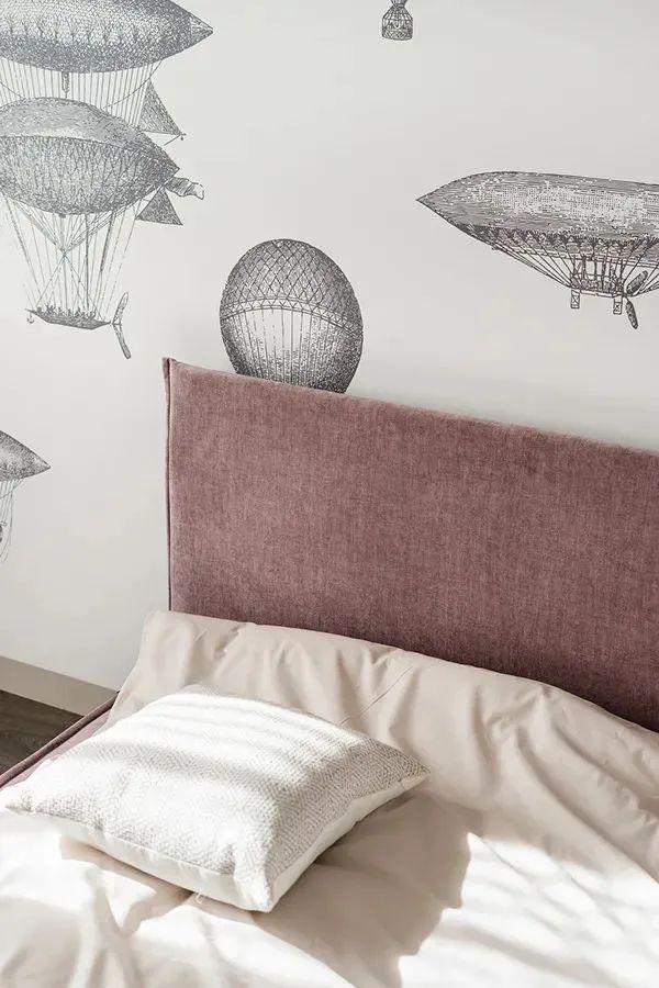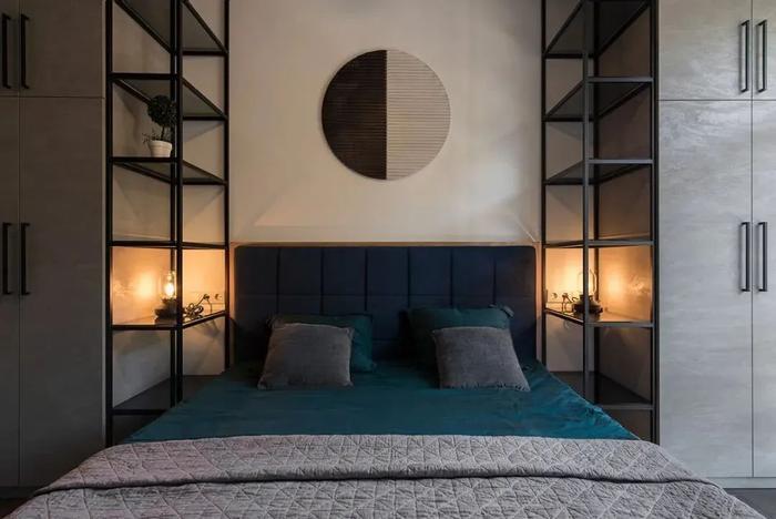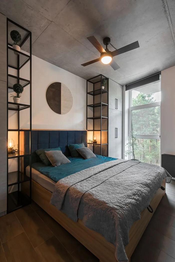 裸露的水泥墙延续到了卧室,线条搭构增加层次感,大胆的配色也让空间充满火花。