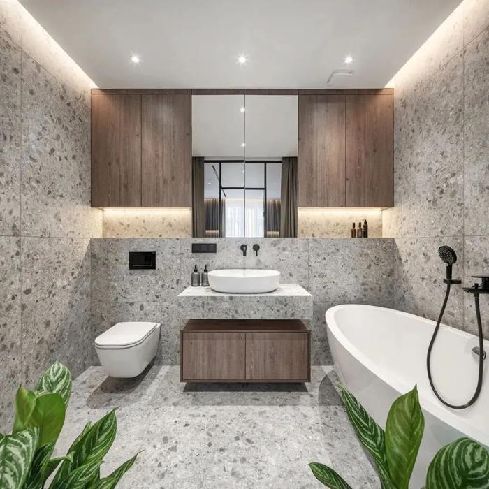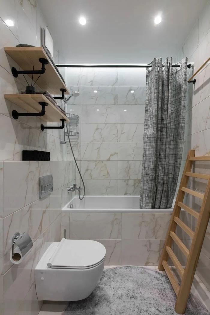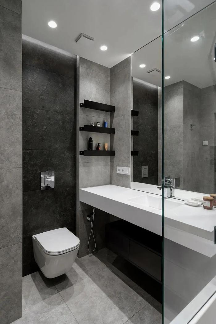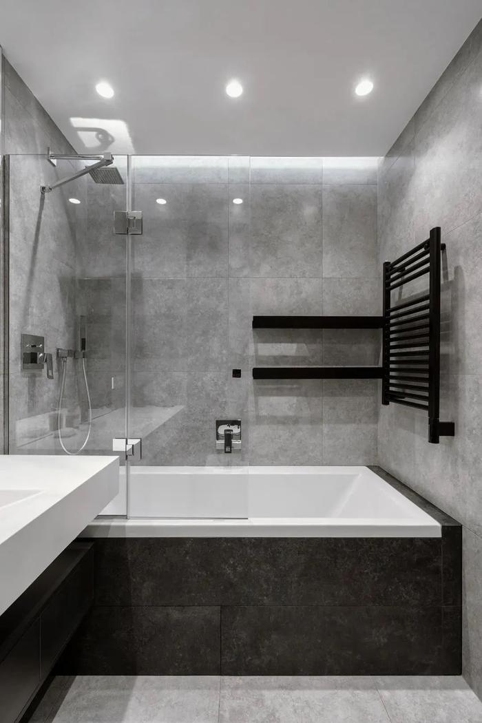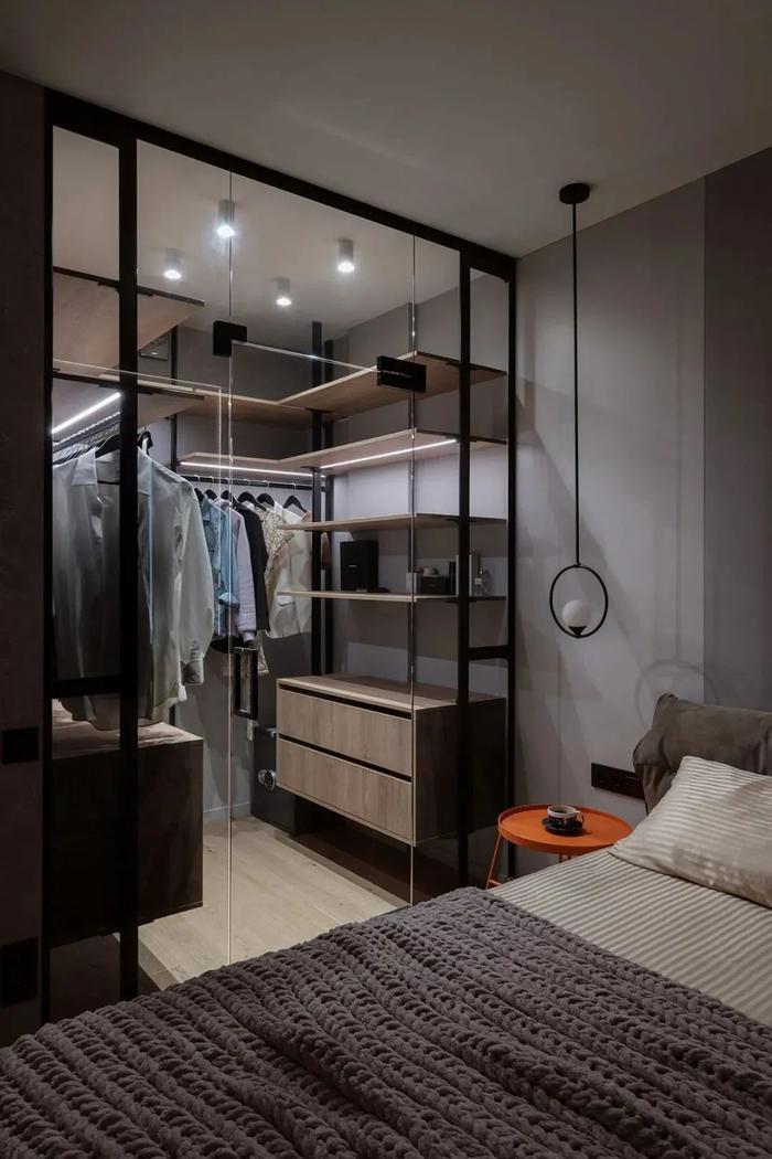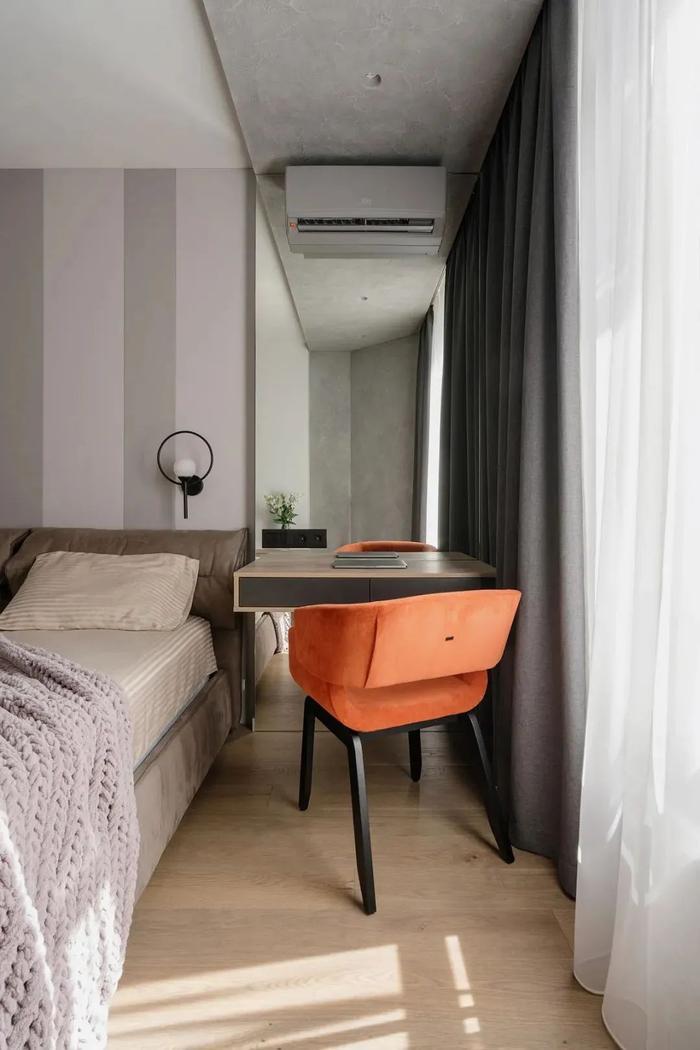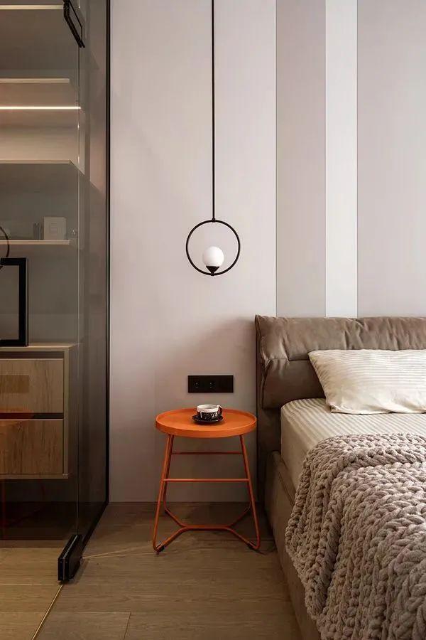 卧室延续客厅的风格,线条的排列,橙色作为作为亮色点缀,不对称的床头灯也能找到一个平衡点,将艺术感拉满。浴室以灰色作为主色调,大理石与玻璃的搭配,沉稳中又得到轻盈的释放。