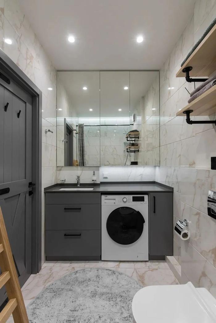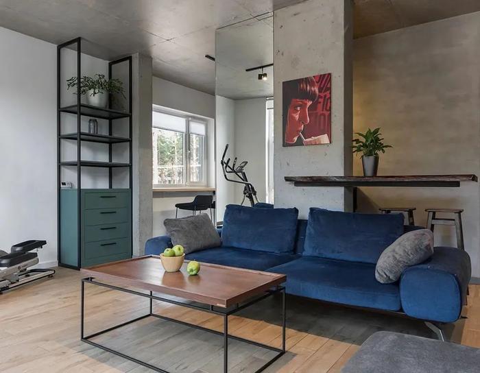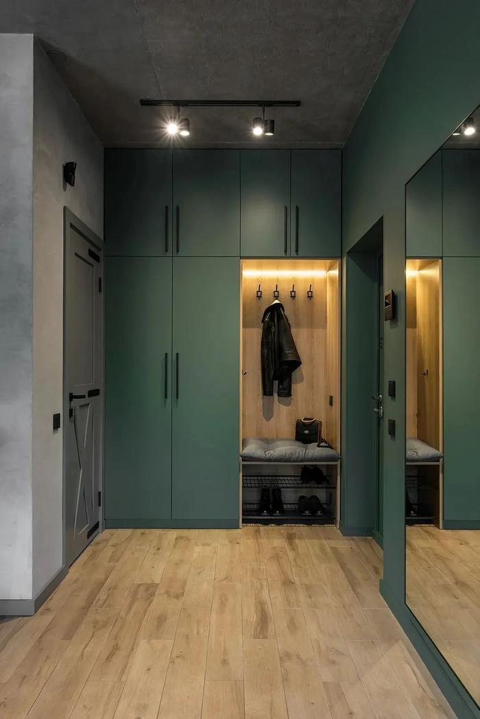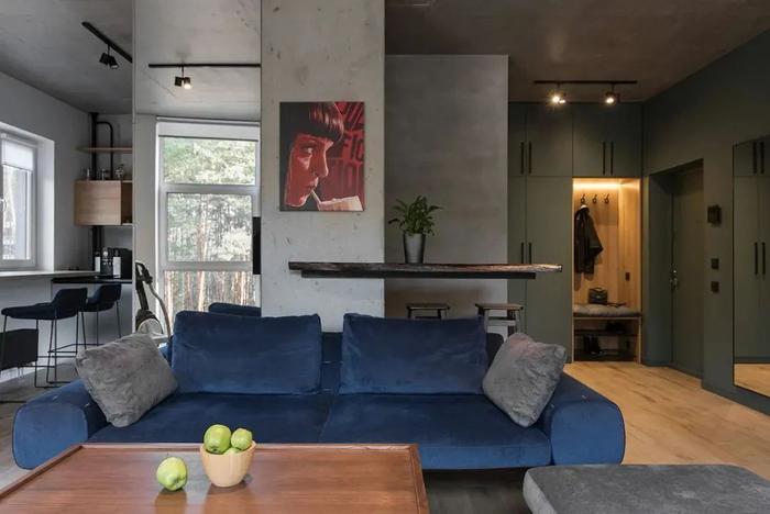 60㎡的LOFT公寓,混凝土作为主基调,墨绿色作为搭配营造出优雅活力的气氛。玄关处的衣帽收纳与镜面,沉稳中带有律动。内部混凝土的灰色更有高级感,高饱和度的色调点缀增加空间的活力。