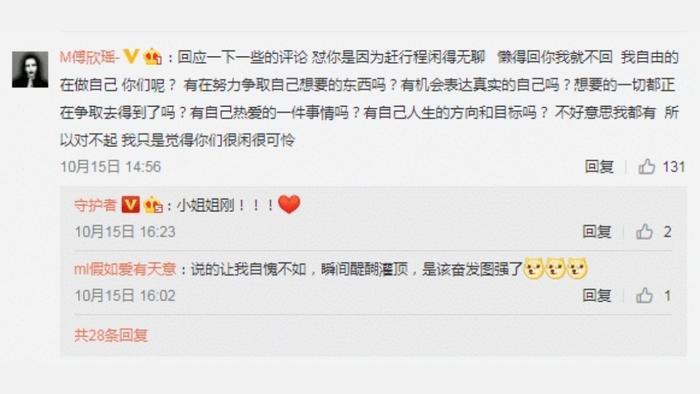 反观傅欣瑶,不管是节目组的“安排”,还是她自己的选择,可以说都注定了后面的节奏!如果是节目组的安排,那很明显应该要拒绝的,因为一旦三杀高睿,搭上的一定是自己的人品!当然了,也可能是她自己并没有意识到,这也就跟她自己选择一样的无脑了!事实上从其在微博上跟网友的互怼中能看出,这应该就是她自己的选择,而且还理直气壮!