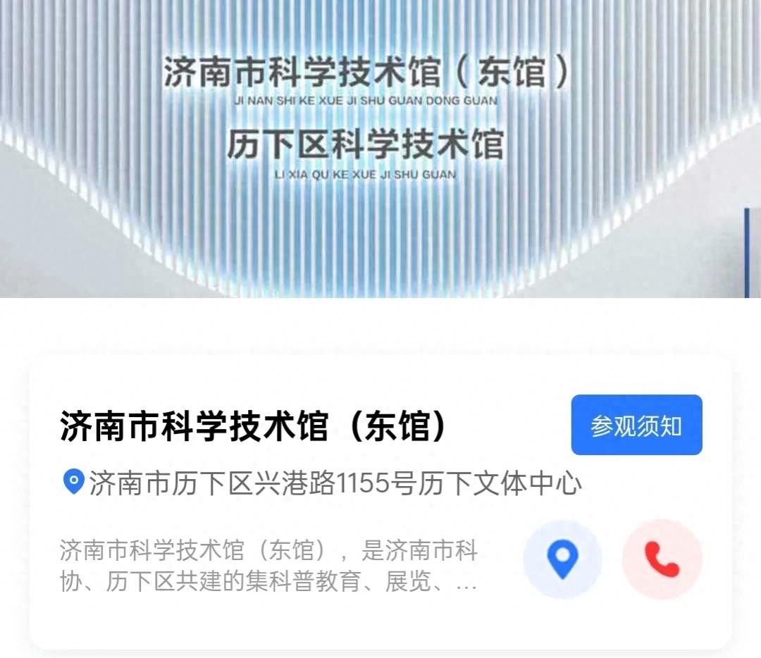 济南市科学技术馆(东馆)面向社会公众免费开放但需要预约,开展临时展览、科普报告、科技论坛,青少年科普研学、科技竞赛和培训等活动,广泛弘扬科学精神,传播科学知识、科学思想、科学方法,提升全民科学素质。