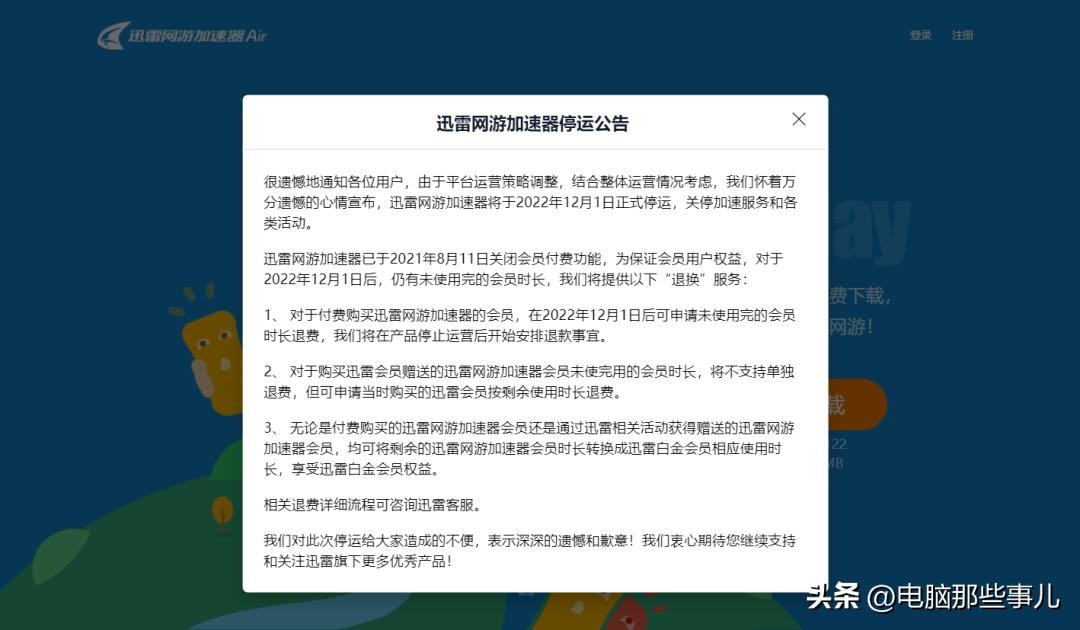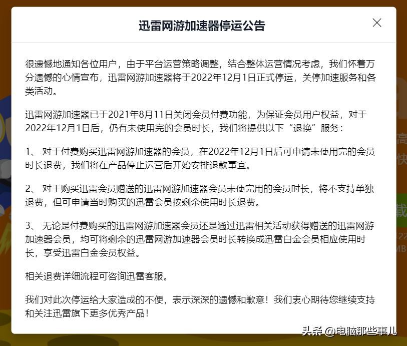 不过,近日“事儿哥”登录迅雷网游加速器官网发现,官网会弹出停运通知,宣布由于平台运营策略调整,结合整体运营情况考虑,迅雷网游加速器将于2022年12月1日正式停运,关停加速服务和各类活动。