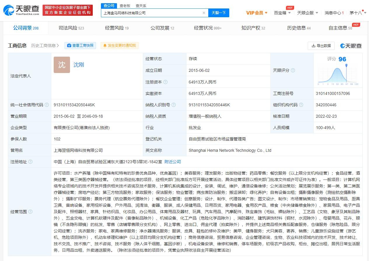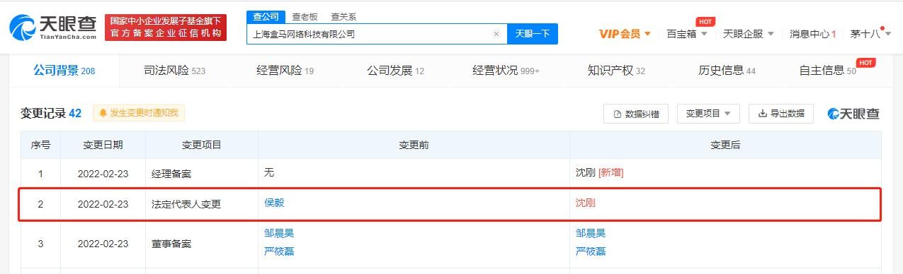 【大河财立方消息】天眼查App显示,2月23日,上海盒马网络科技有限公司发生工商变更,法定代表人由侯毅变更为沈刚,沈刚同时接任上海盒马公司的董事长总经理职务。