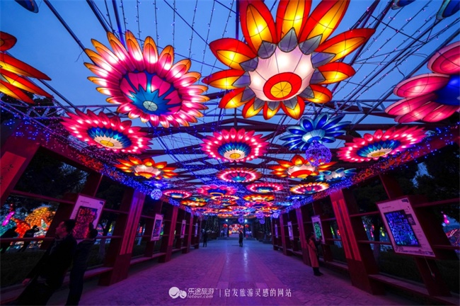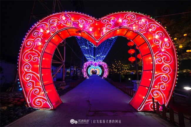 《浪漫话语》用五彩斑斓的心形拱门和鲜花造型,让人在花的世界中仿佛能嗅到阵阵花香,沉浸于这唯美浪漫的世界之中。形态各异的创意彩灯将龙亭、天波杨府点亮。