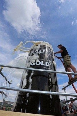 主办单位爬上脚手架顶部向酒瓶中倒入当地酿造的STOD折的黄金麦酒,以便数千名观众观看和分享。