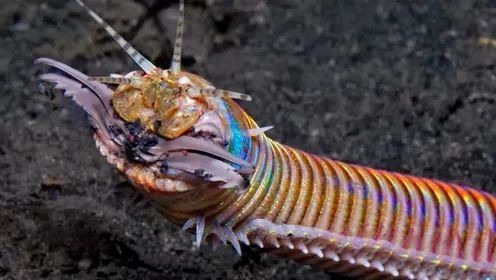 作为世界上体长最长的多毛动物,它也是一种凶猛的食肉性海洋动物,它们常常潜伏在海底,利用身上的“彩虹色”来吸引猎物,当有猎物经过身旁时,它们就会突然发动袭击,利用它们锋利的下颚,直接将大型动物截肢、撕碎,然后再开始进食。