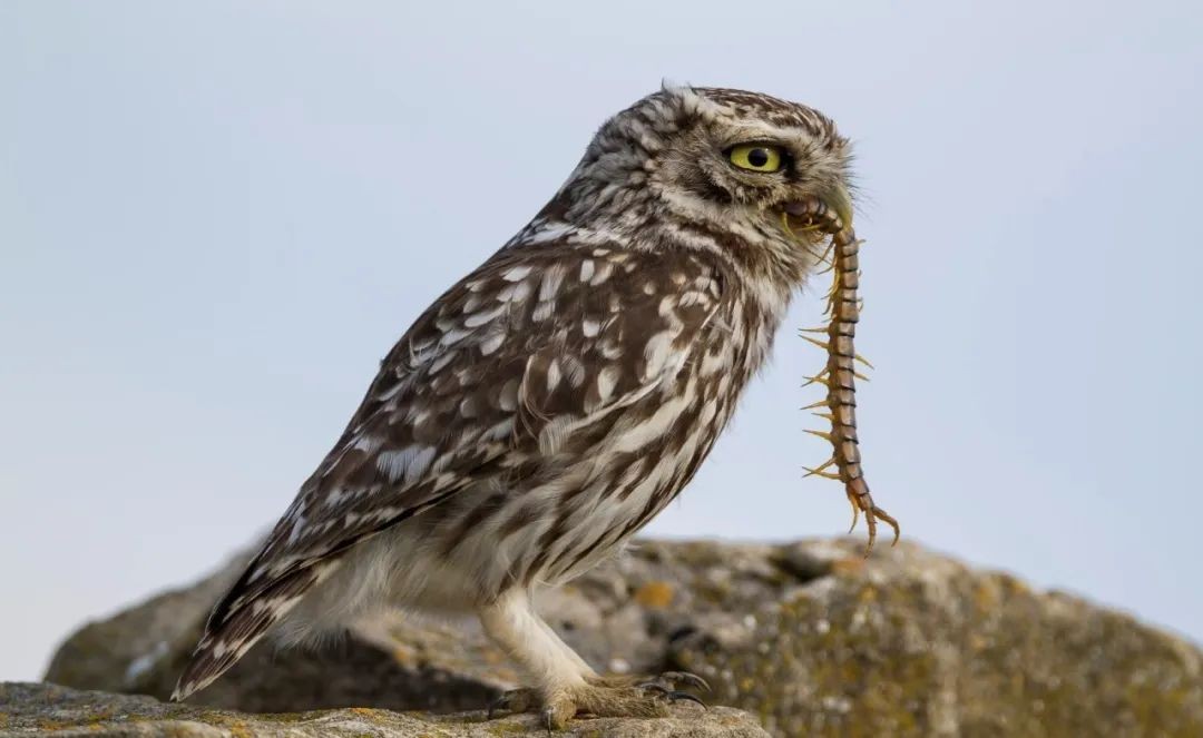不少人见到姬鸮的模样,都被它可爱的外表给迷惑了,但是在残酷的沙漠中生存,它们的内心早就是凶猛无比了,环境让它们不能不进化成如此,为了生存,它们沙漠都吃,沙漠昆虫、蜘蛛、蜈蚣等,完全不挑食 的。