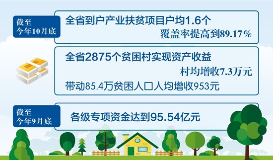 我省把产业扶贫放在突出位置。截至10月底,全省到户产业扶贫项目户均1.6个,覆盖率提高到89.17%,到村产业扶贫项目实现全覆盖;通过“三变”改革,全省2875个贫困村实现资产收益村均增收7.3万元,带动85.4万贫困人口人均增收953元;率先实施光伏扶贫,全省光伏累计装机规模达到199.3万千瓦,惠及41.28万贫困户。
