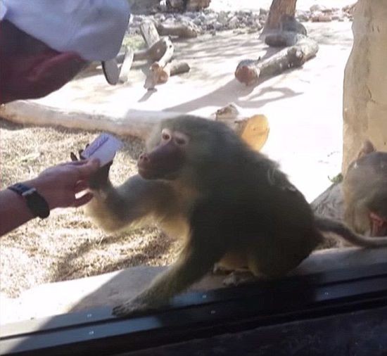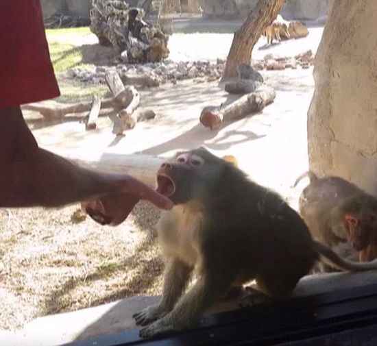 游客精湛的魔术令狒狒张大嘴巴,震惊不已。狒狒看着游客空无一物的手掌,甚至还想上前掰开手指,看看刚才的纸牌到底去了哪里。但可惜由于玻璃的阻挡,狒狒并不能碰到游客的手。