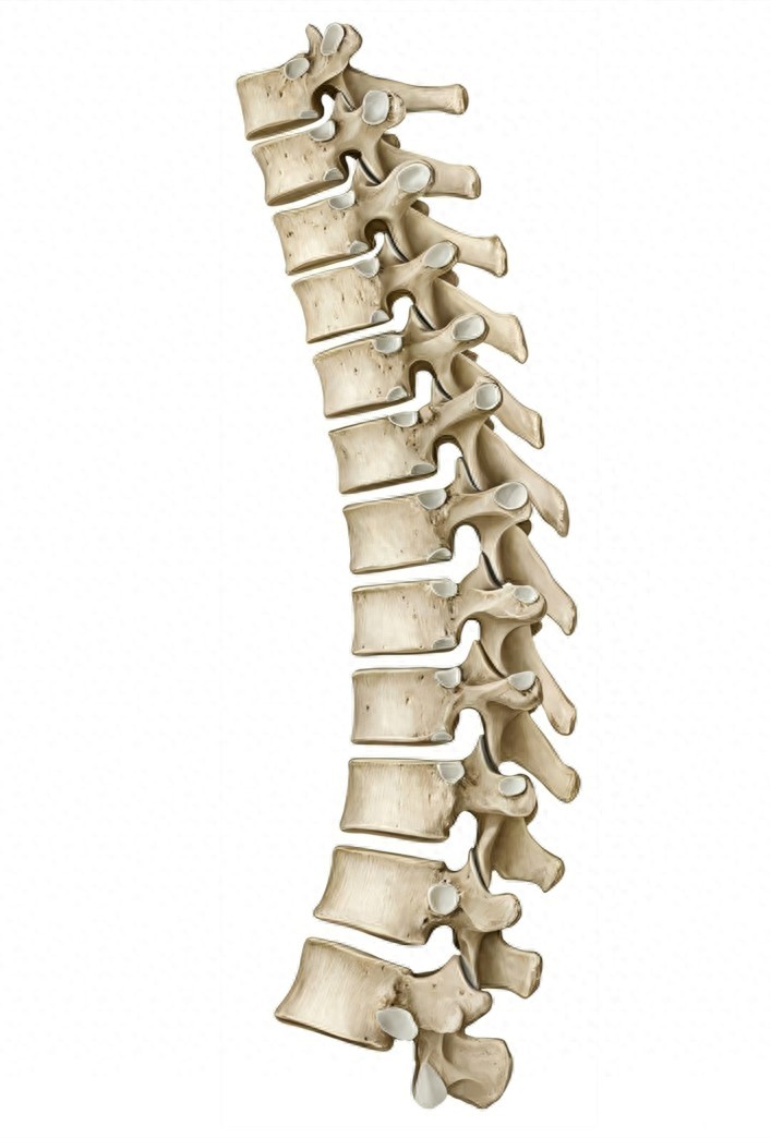 胸椎包括了12块椎骨,胸椎段是脊柱中最长的区域。正常情况下,胸椎拥有平滑的、轻微向后的生理性弯曲,称为胸曲,该弯曲主要由胸椎椎体的形状决定。
