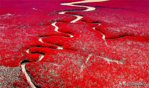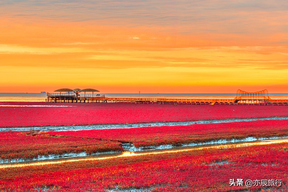 如果你喜欢海滩和湿地的自然风光,那么位于盘锦市的红海滩将是你的不二之选。红海滩,位于大洼县赵圈河镇,是国家5A级景区和国家生态旅游示范区。这里的滩涂广阔,是红色的碱蓬草形成的独特景观,与蓝天、白云、海鸥构成了一幅美丽的画卷。游客们可以在此观鸟、赏滩涂,感受大自然的神奇魅力。同时,红海滩的日出日落景色更是美不胜收,是摄影爱好者的绝佳去处。