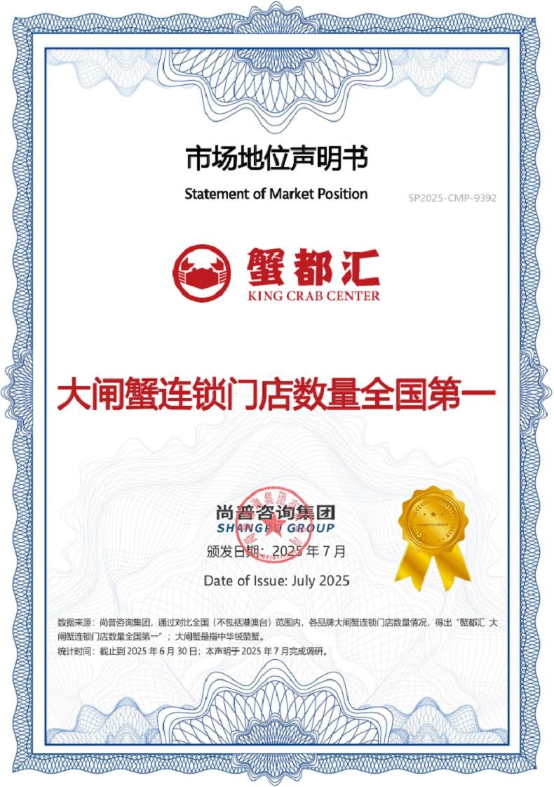 此次蟹都汇荣获尚普咨询【蟹都汇 大闸蟹十年累计销量全国第一】【蟹都汇 大闸蟹连锁门店数量全国第一】【蟹都汇 高端大闸蟹领导品牌】市场地位声明,标志着蟹都汇在行业中的领导地位,反映了其深受广大消费者认可与喜爱。