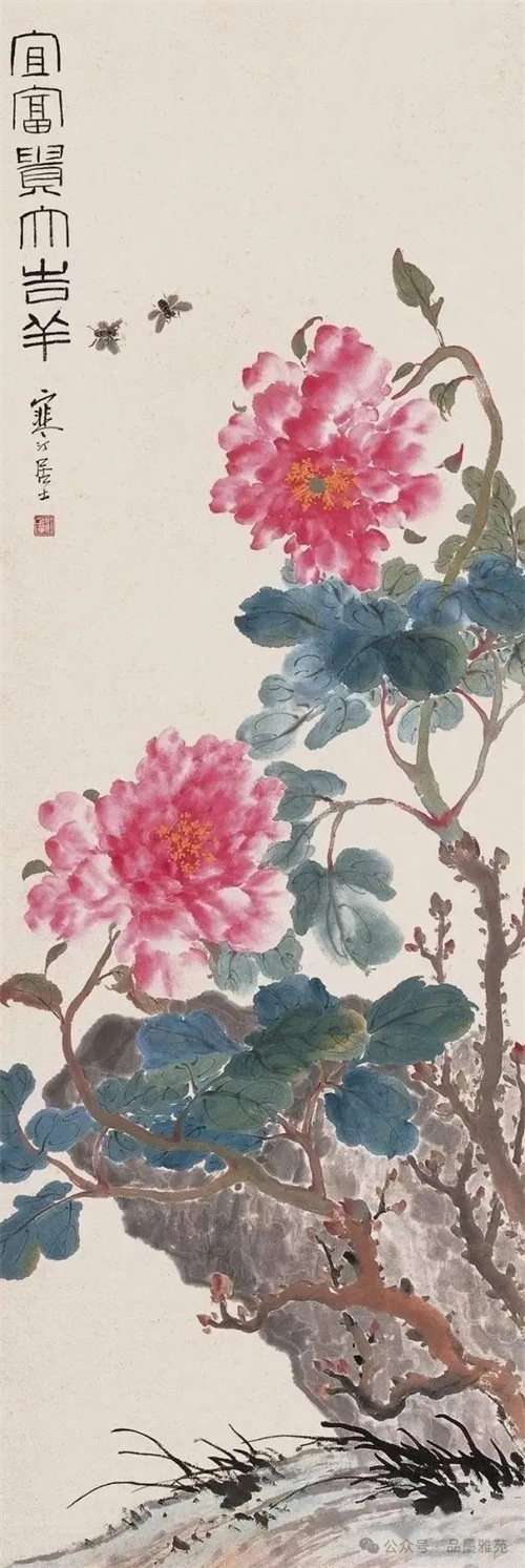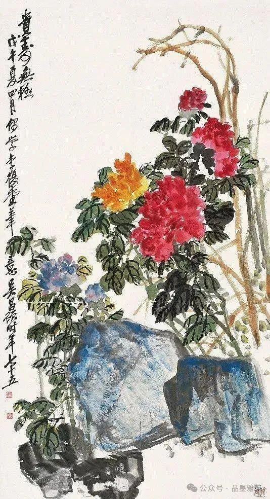 吴昌硕因以“草篆书”入画,状物不求写实,形成了影响近现代中国画坛的直抒胸襟,酣畅淋漓的“大写意”笔墨形式。吴昌硕善画牡丹,公推为清末以来第一人。