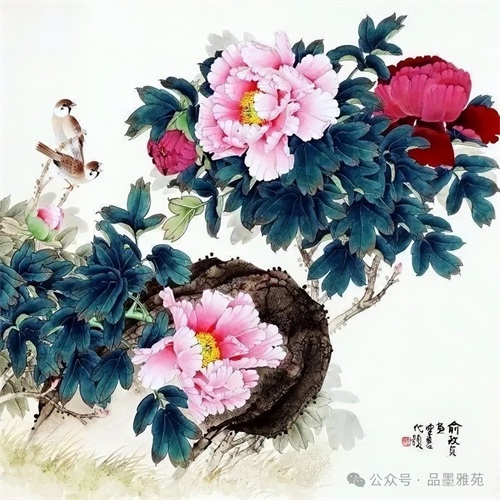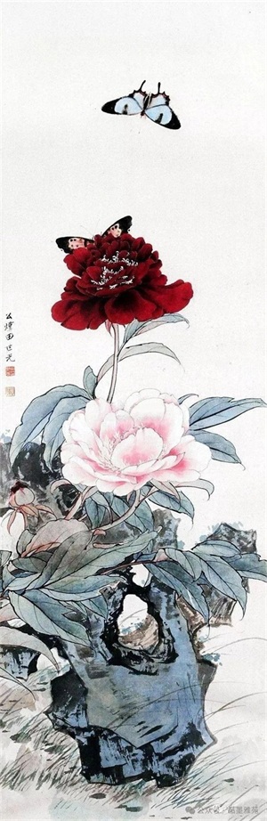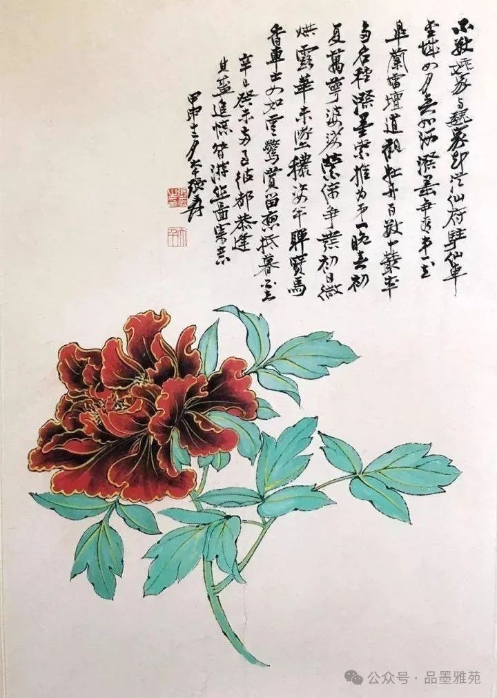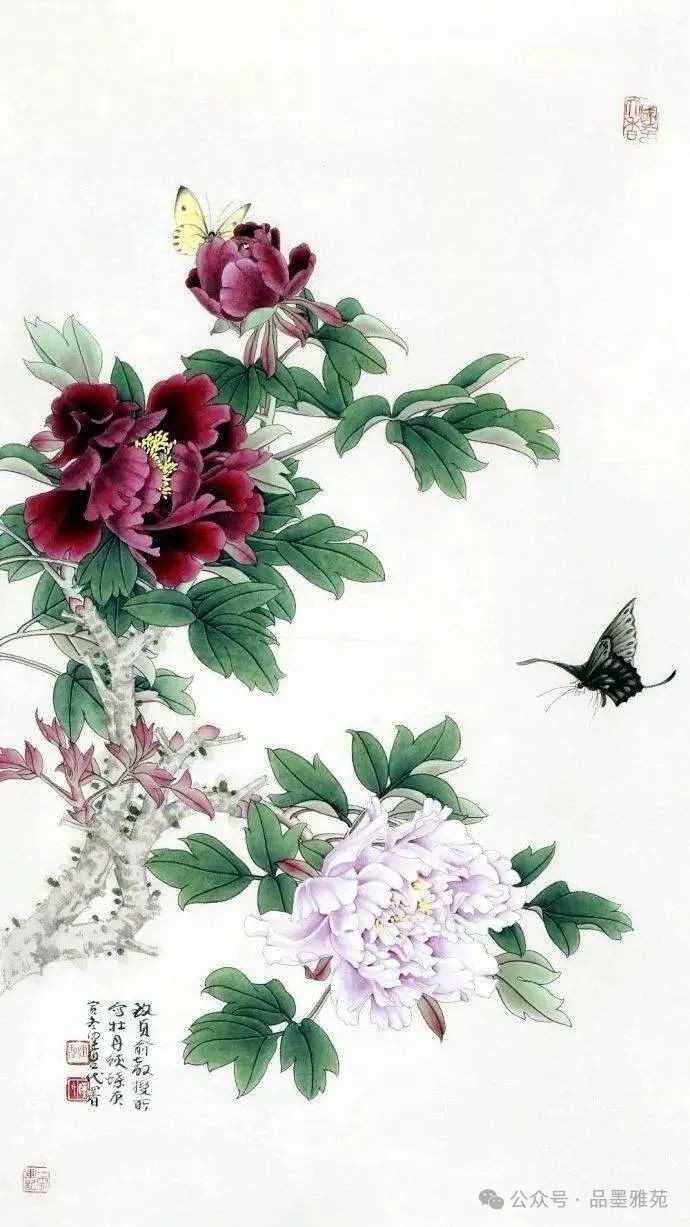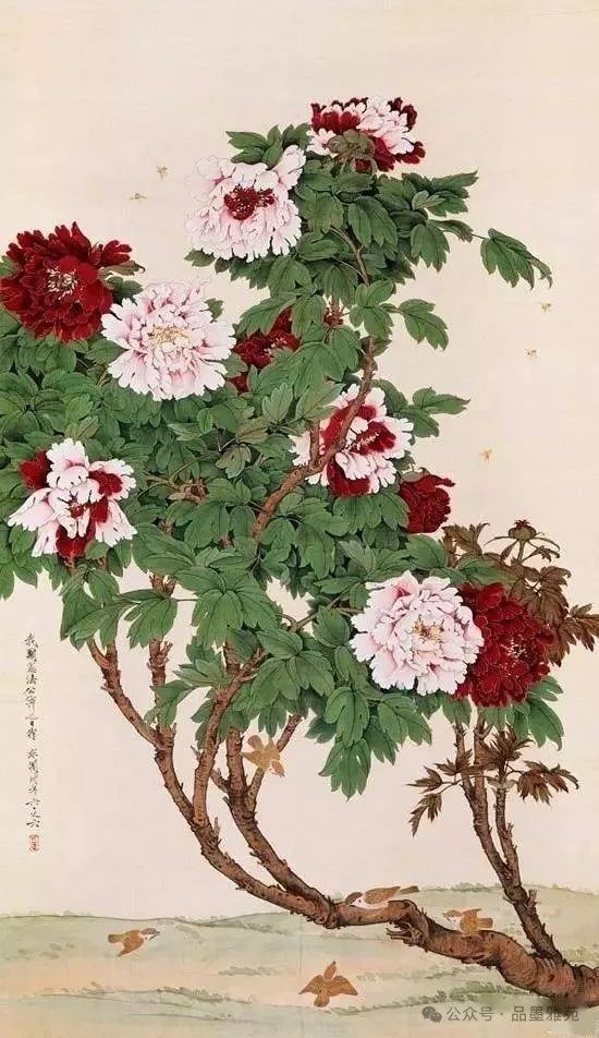 张大千画花卉原本是取法于元明文人写意风格,但自1943年从敦煌临习壁画归来后,开始转变画风,致力于精笔工细、赋彩妍丽的画法、直朔唐宋诸家,所作牡丹较宋之前贤,别自俏立,独成一家。