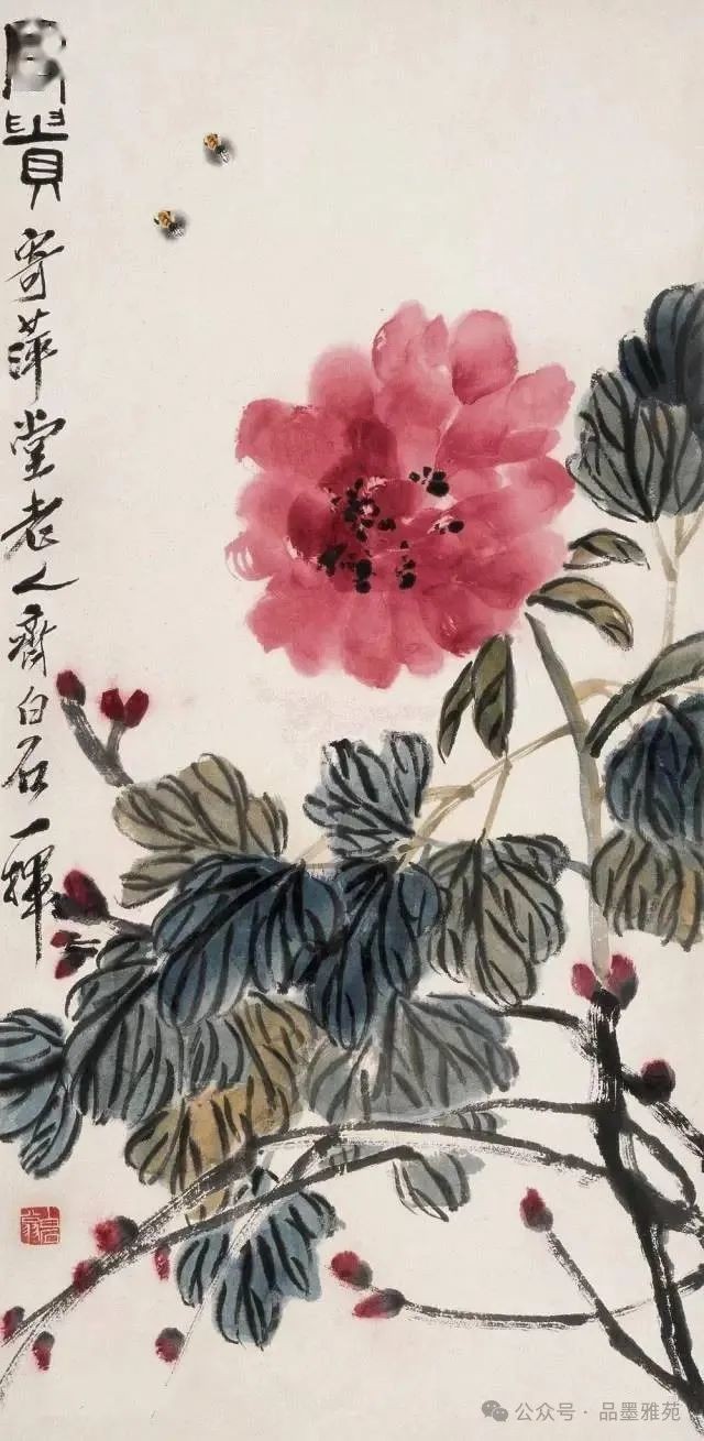 齐白石画牡丹画叶子的走向与其他画家不同。大多数画家画牡丹,叶子都是向上仰起的,这样画整体显得精神,而白石老人的牡丹叶子却是下垂的。