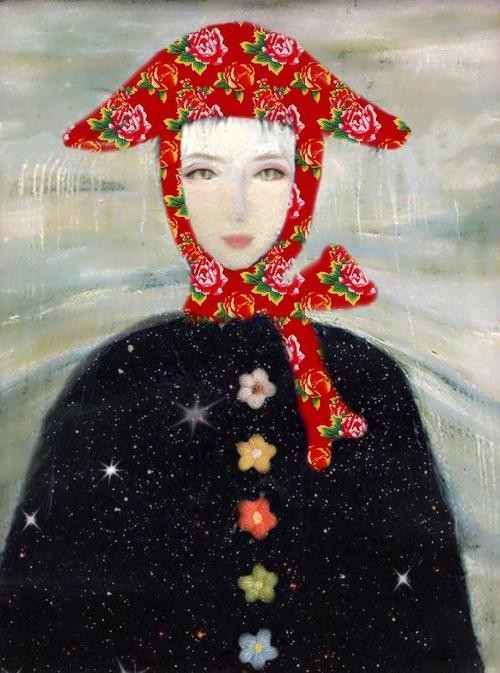 3. 绘画手法——采用超级主观的表现手法;眼皮处颜料较厚,在光线中投下阴影,女人像睁开了眼睛一样;帽子下方的流淌效果,像雨又像泪。