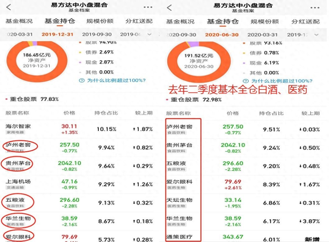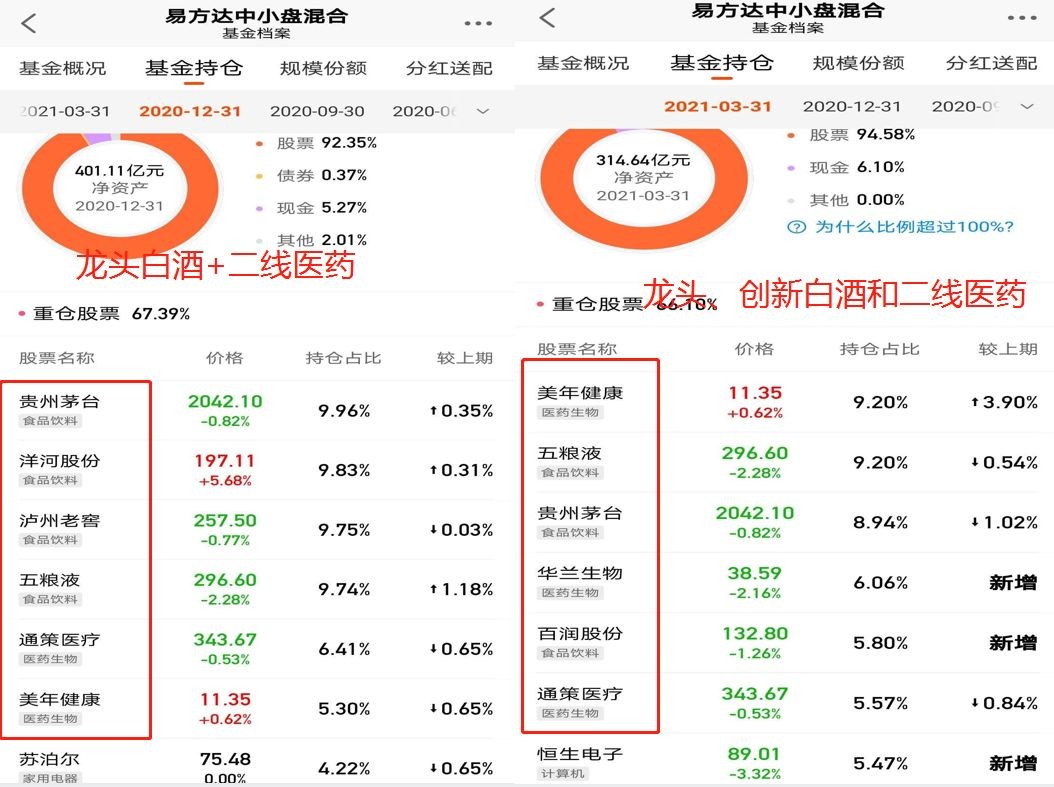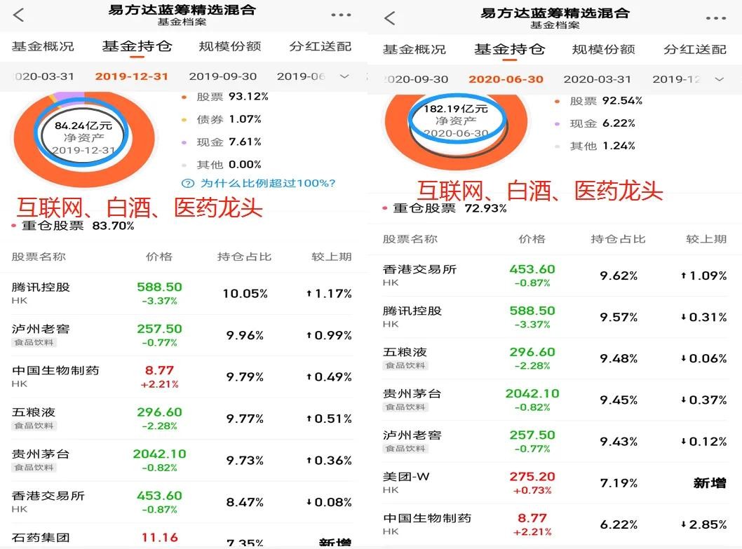 005827易方达蓝筹精选也面临着跟易方达中小盘一样的困境。蓝筹主要持仓在白酒、互联网龙头,从年后来看一线白酒大跌反弹滞涨,二线白酒大涨,互联网龙头大跌。这里再看一组数据19年12月31日蓝筹市值是84亿,20年12月31日是677亿,同比大增706%。这里我想大家基本知道19年易方达蓝筹疯狂的原因了吧,最主要原因是强大的资金买入,大家抬着基一路高歌,当然最后的一批是站岗者。
