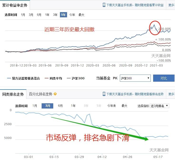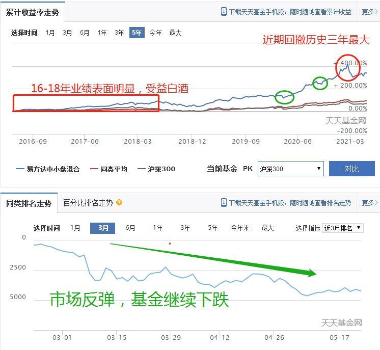 张坤代表基金110011易方达中小盘,近三年历史回撤最大,且在今年年后市场反弹阶段,易方达中小盘净值反而继续下挫,主要原因是持仓不佳。很多人会疑惑,为什么20年基金走势涨幅较大?两方面原因:一、整体市场牛市,高档白酒、医药涨幅较大,这是张坤主要持仓品种。二、名气效应。易方达中小盘在19年12月31日市值是186亿、20年12月31日市值是401亿,同比大增116%,可想而知是大家的疯狂买入直接推升了基金估值的上升,大家疯狂的买入,这部分资金在二级市场上购入张坤持仓股票,导致基金持仓个股大涨。当然大家的赎回、也导致基金估值大幅下跌。谁是始作俑者?当然张坤在年前也开始限制易方达中小盘的申购和赎回,确实是无奈之举。