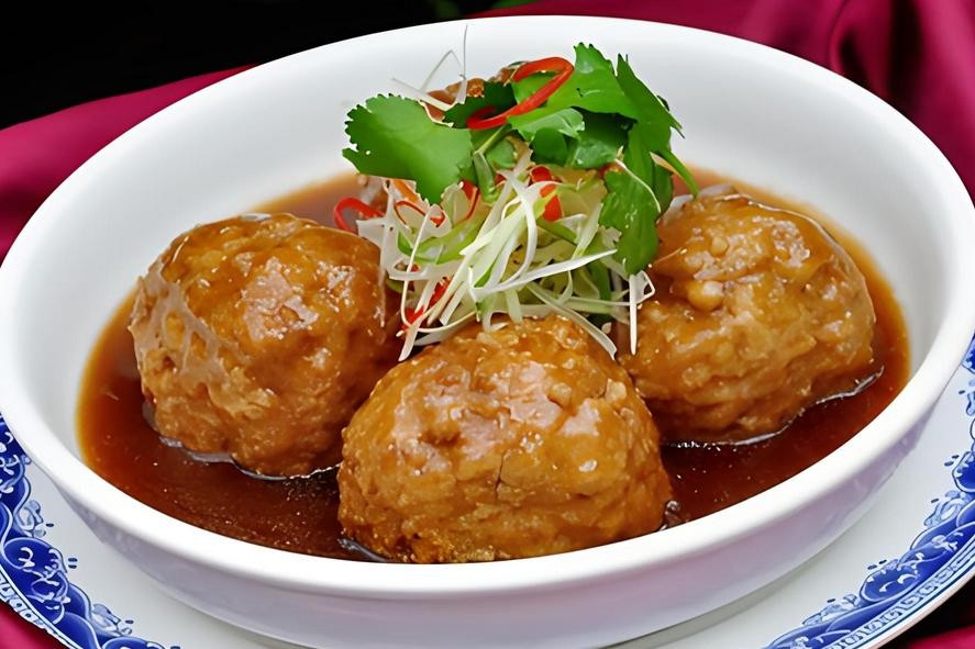 将猪肉剁成肉泥,加入调料拌匀,制成肉丸后油炸至金黄色,再用酱油、糖、料酒等烧制而成。