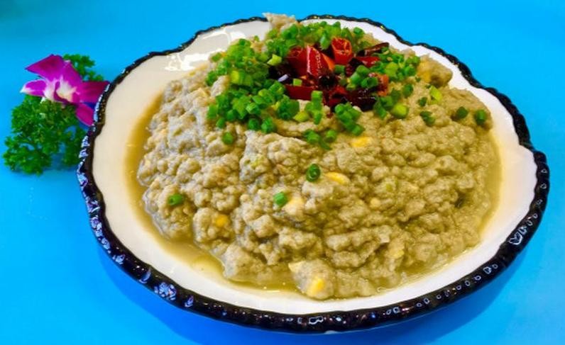 这道菜的特色是口感香醇、豆香浓郁,先将绿豆渣炒熟,再加入葱姜蒜等调料炒匀即可。