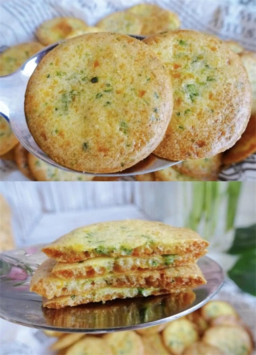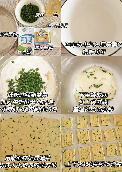 低筋面粉+酵母+葱花揉面,发酵后擀平切割,180℃烤至金黄!