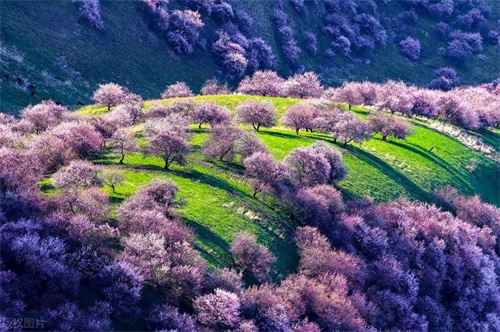 伊犁杏花沟有着中国最美杏花的美誉。这里是一片中世纪遗留最大的原始野杏林,占地有3万多亩。每年4月初至5月,杏花盛开时,伊犁河谷就是一条断续分布长达300多公里的杏花景观长廊。站在山腰上俯瞰,白色的、粉红的、深红的杏花覆盖了整个山坡,仿佛置身于仙境之中。