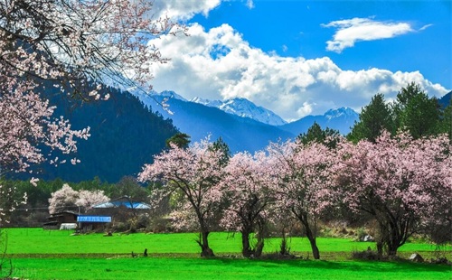 在林芝县城东南方向约5公里处,有一片天然野生桃林,被称为桃花沟。这里的桃花以壮阔取胜,尼洋河畔的蓝是最好的背景,还有那些星罗棋布的藏式民居,也是花海中最好的点缀。每年3月中下旬,林芝都会举办一次盛大的桃花节,吸引无数游客前来观赏。