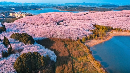 红枫湖平坝万亩樱花园占地2.4万余亩,种植了近70万株名贵樱花,被誉为蓝色星球最美樱花园之一。这里的樱花品种繁多,有白色的早樱和粉色的晚樱交替登场,构成了一片花的海洋。在樱花盛开期间,还会举办盛大的樱花节活动,让游客们充分感受到春天的美好。