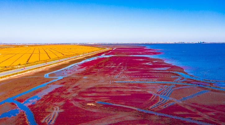 盘锦红海滩老独特,它面积超 20 万亩,是世界最大的红色滩涂。每年 9 到 10 月,碱蓬草红得像火一样,那一片红色海洋,和旁边蓝色的大海、蓝色的天空一搭配,漂亮得不像话。这时候每天来观赏拍照的游客超 4 万人次,都想把这美丽景色留在镜头里。