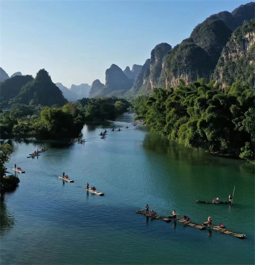 遇龙河是漓江的主要支流之一,以其宁静而美丽的田园风光而闻名。在这里,你可以乘坐竹筏漂流,欣赏沿岸的农田、古桥和村庄。遇龙河的河水清澈见底,河岸两侧的山峦如画般展开,构成了一幅完美的山水画卷。